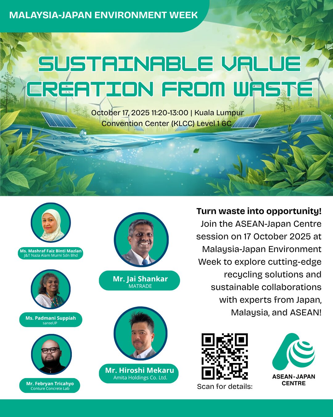 The dialogue, “Sustainable Value Creation from Waste,” will explore opportunities for value-added recycling and circular solutions. Insights will be shared by experts and companies from Japan, Malaysia, and ASEAN, followed by an open discussion to deepen collaboration for a more sustainable future.