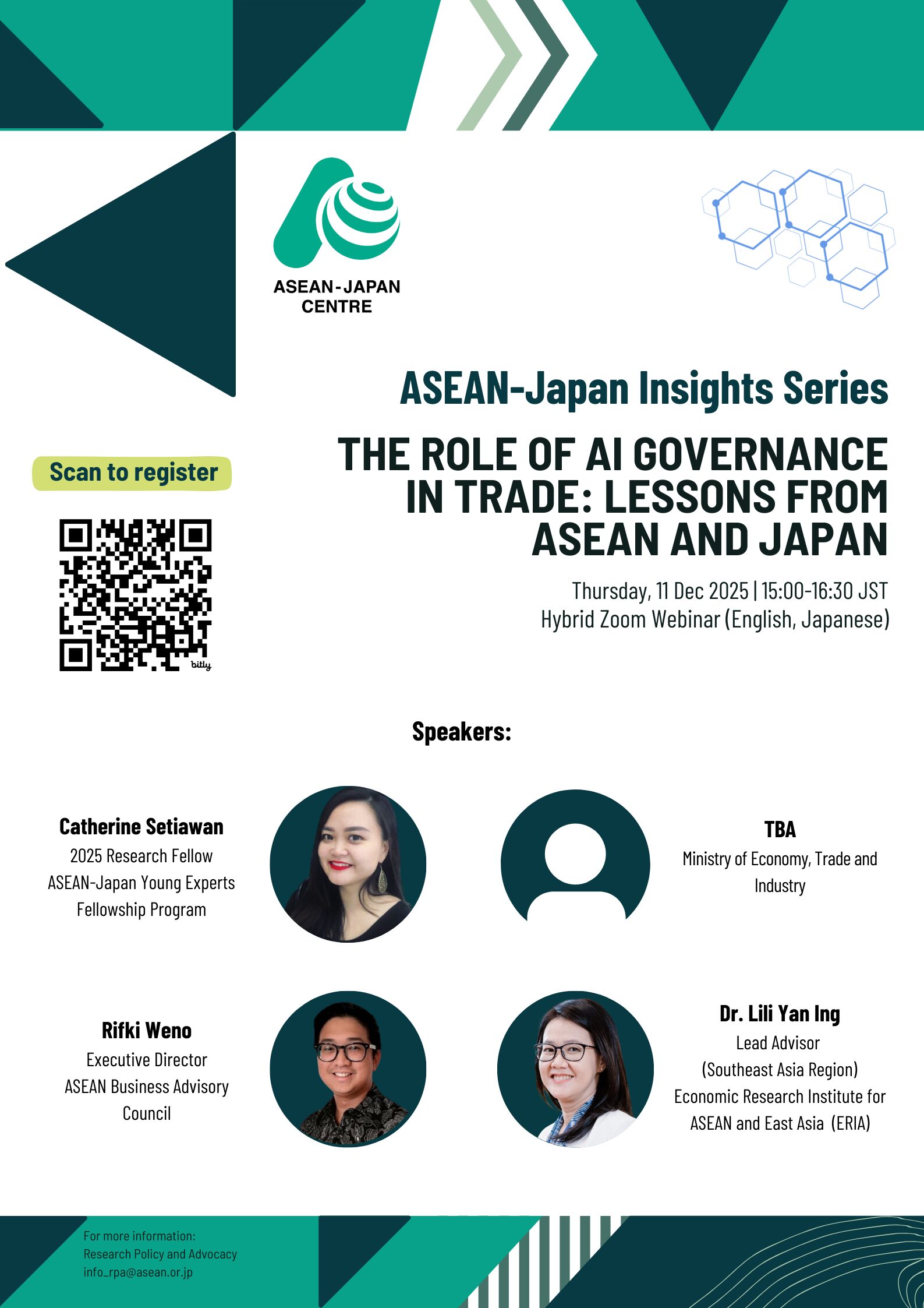 This webinar, “The Role of AI Governance in Trade: Lessons from ASEAN and Japan,” examines how artificial intelligence is reshaping cross-border trade, business practices, and economic policy. With AI rapidly transforming the global digital marketplace, effective governance frameworks have become essential to ensure innovation, competitiveness, security, and trust.
