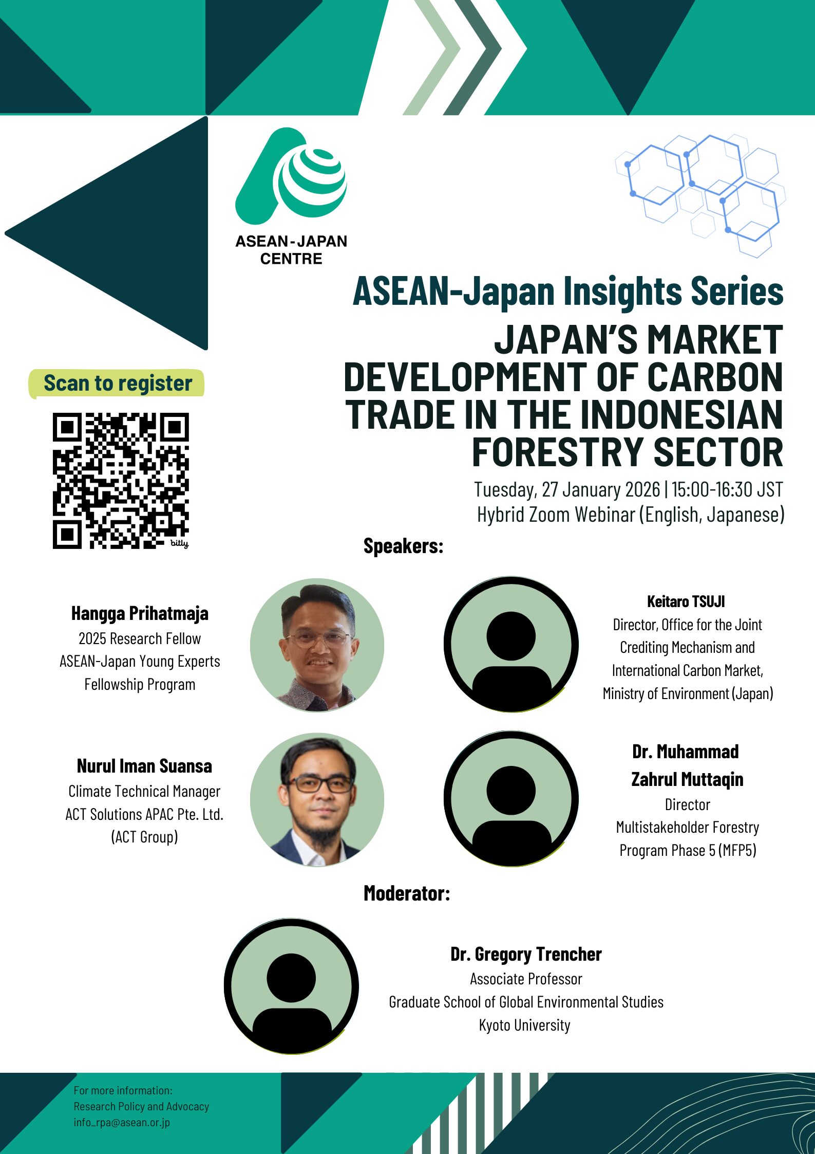 The session will highlight opportunities for bilateral cooperation, investment, and capacity building, while also addressing key challenges such as market integrity, regulatory clarity, land tenure, and social and environmental safeguards. By bringing together research insights and practitioner perspectives, the webinar aims to identify practical pathways for strengthening high-integrity carbon markets and promoting sustainable, nature-based solutions across ASEAN and Japan.