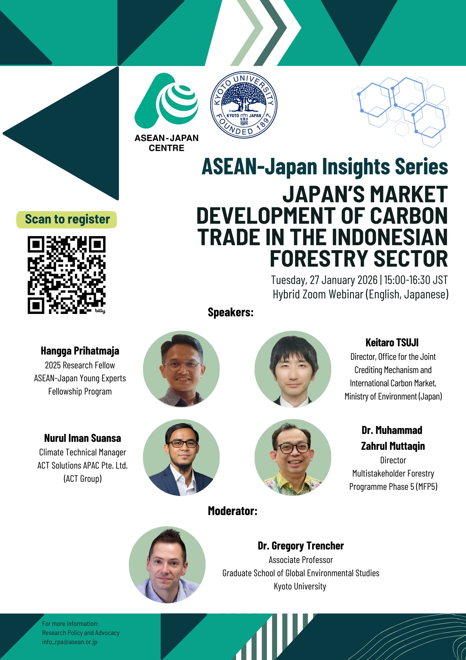 Co-organized with the Kyoto University ASEAN Center, the webinar titled “Japan’s Market Development of Carbon Trade in the Indonesian Forestry Sector” explores how Japan and Indonesia are advancing forest-based carbon markets as part of their net-zero strategies. It examines Japan’s experience in developing transparent and well-regulated carbon trading systems, including policy frameworks, market mechanisms, and monitoring, reporting, and verification (MRV) standards, and considers how these lessons can support Indonesia’s growing forestry-based carbon trade under its FOLU Net Sink 2030 program.