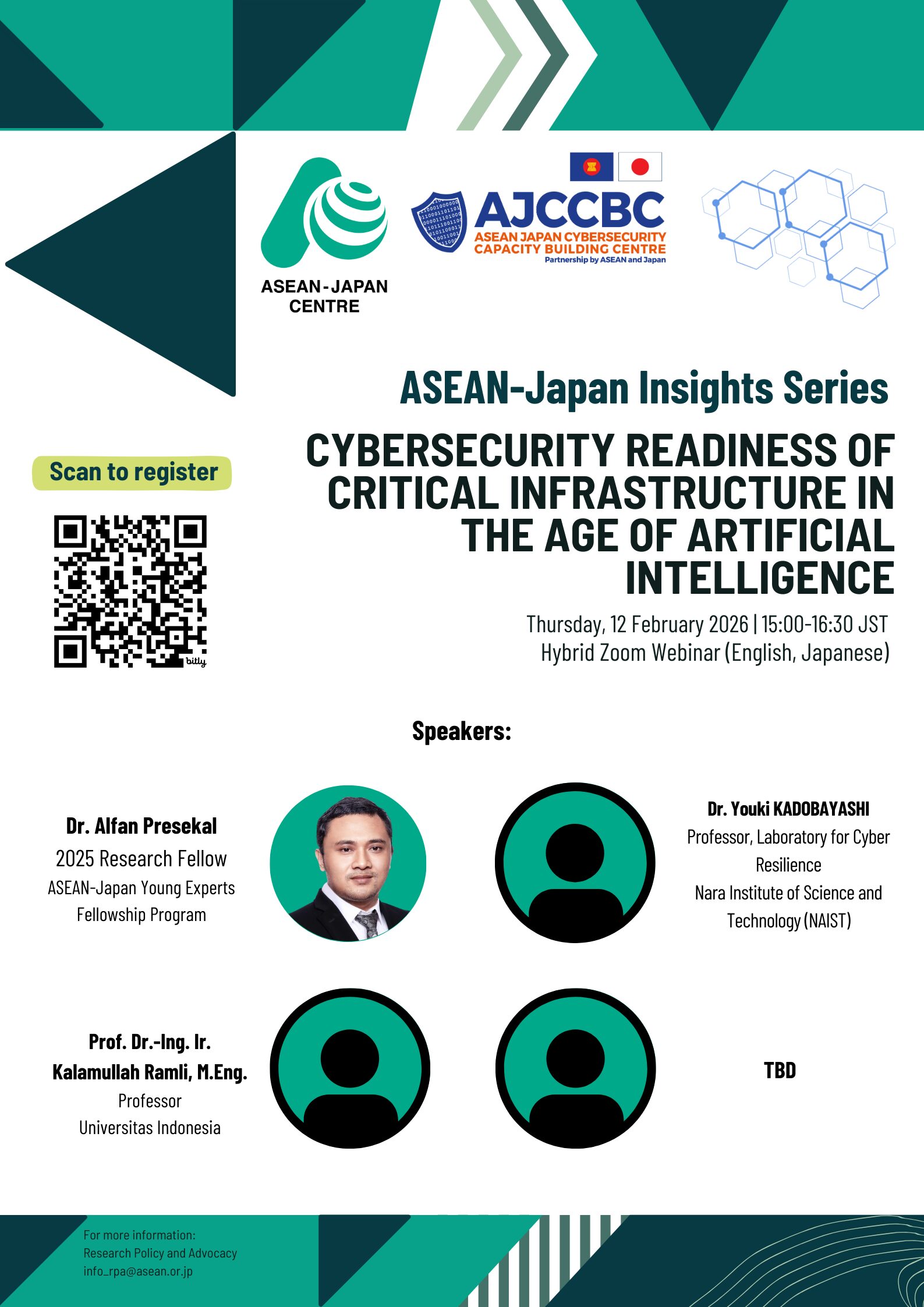The webinar will draw on ongoing ASEAN–Japan cooperation to discuss policy alignment, AI-enabled threat intelligence, cybersecurity governance, and regional capacity building. It will highlight emerging risks to critical infrastructure, including cyberattacks on energy systems and supply chains, while also examining how AI-driven tools can enhance detection, response, and resilience. The session will also feature the ASEAN-Japan Young Experts Research Fellow presenting his findings on cybersecurity readiness in the age of AI, drawing on case studies from the ASEAN Member States, with particular attention to Indonesia. By bringing together research insights and practitioner perspectives from academia, government, and industry, the webinar aims to identify practical pathways for strengthening cybersecurity readiness and advancing regional cooperation in the age of AI.