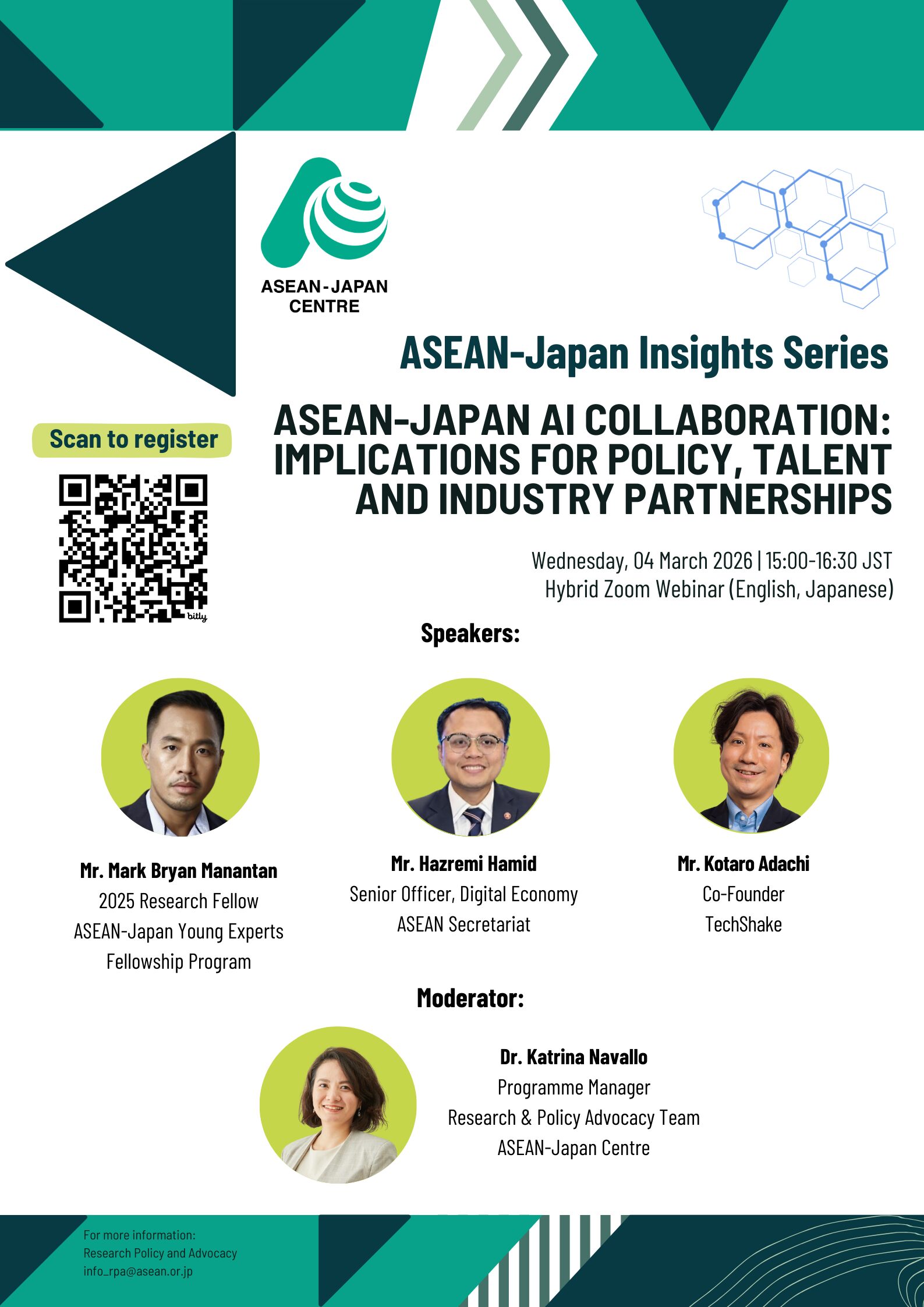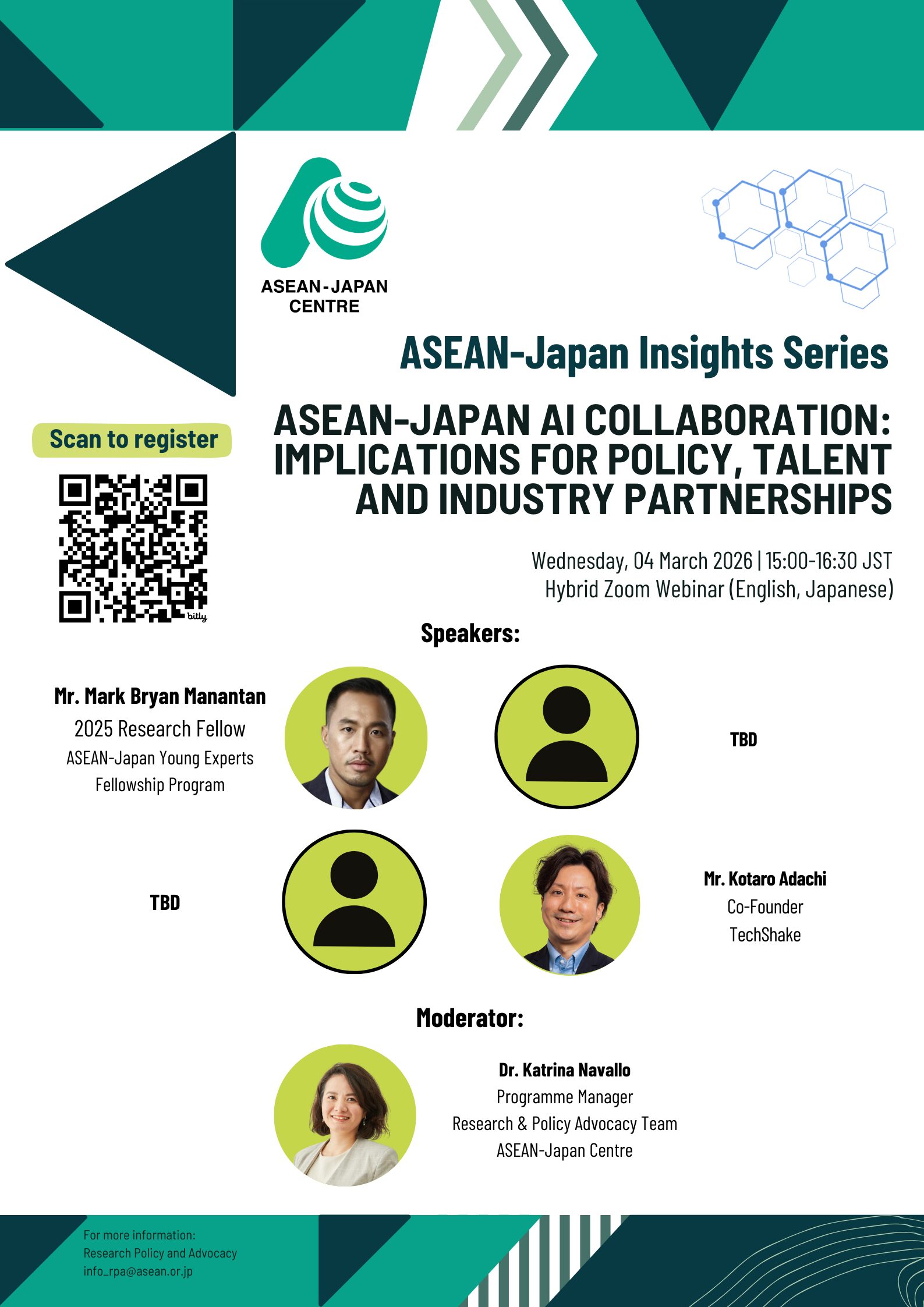 The ASEAN-Japan Insights Series is the Centre’s flagship hybrid, bilingual (English–Japanese) webinar platform designed to provide timely analysis on ASEAN-Japan issues. The Series features emerging topics that shape regional cooperation and supports knowledge sharing among industry, academia, governments, and enterprises across the region.