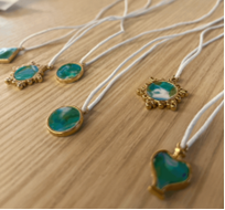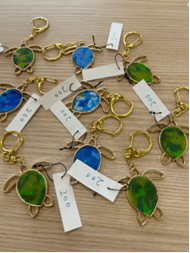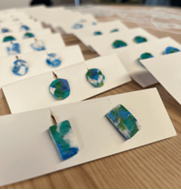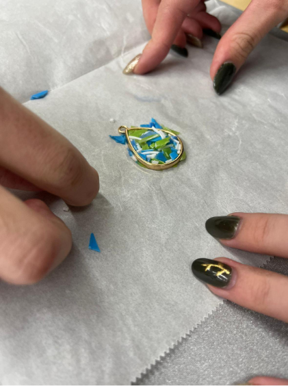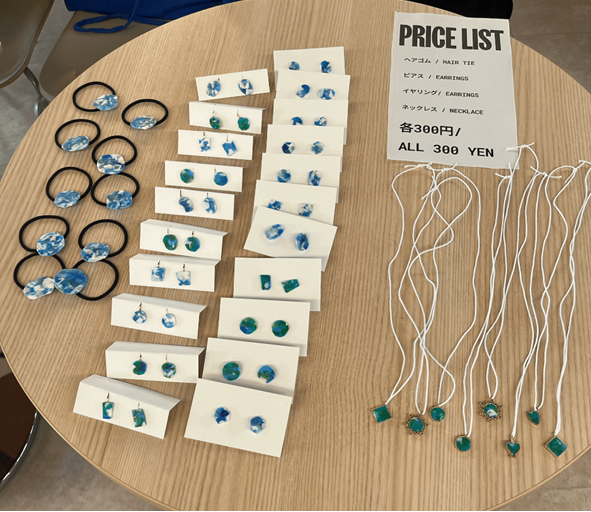Before the event, our team transformed collected marine plastics into beautiful accessories through a creative upcycling process. The plastics gathered during our beach clean-up at Katsurahama Beach were carefully washed, dried, and cut into small pieces of about 2–3 mm. Using a clothes iron, we melted and reshaped them into colorful fragments that resembled gemstones. To make them safe and comfortable to wear, we polished the edges and assembled them into earrings, necklaces, and hair ties.