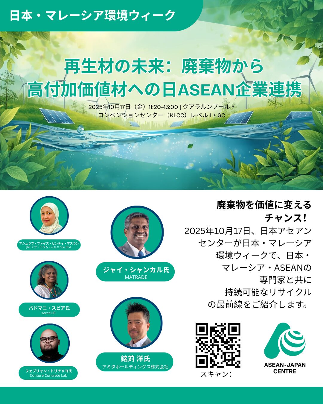 「再生材の未来:廃棄物から高付加価値材への日ASEAN企業連携」のセミナーでは、付加価値型リサイクルや循環型ソリューションの機会について議論します。日本、マレーシア、ASEANからの専門家や企業による発表に加え、持続可能な未来に向けた協力を深めるためのオープンディスカッションも行います。