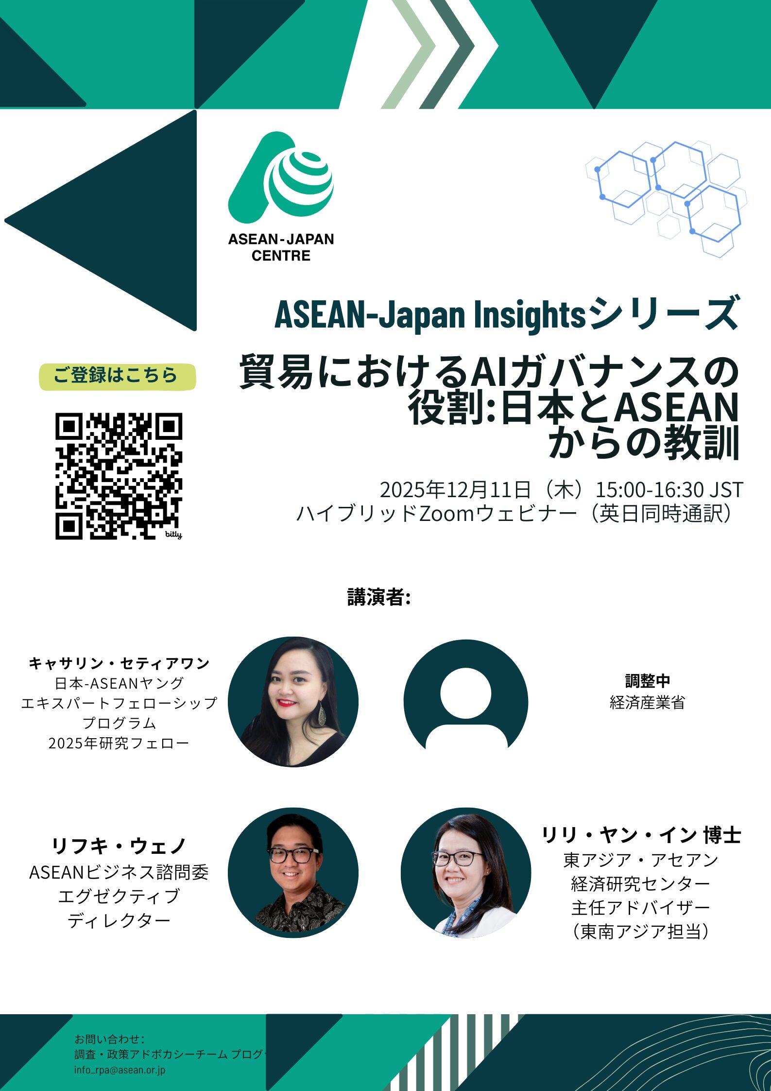 多様で成長著しいデジタル経済を有するASEANは、政策の調和という課題に直面しています。一方、日本は倫理性・国際協調を重視した成熟したAI政策の枠組みを構築しており、両地域は相互に学び合い、将来に向けた協力の可能性を持っています。本ウェビナーでは、ASEANと日本がどのように協力し、貿易を支えるAIガバナンスの強化に向けて共通の道筋を描けるかを議論します。
