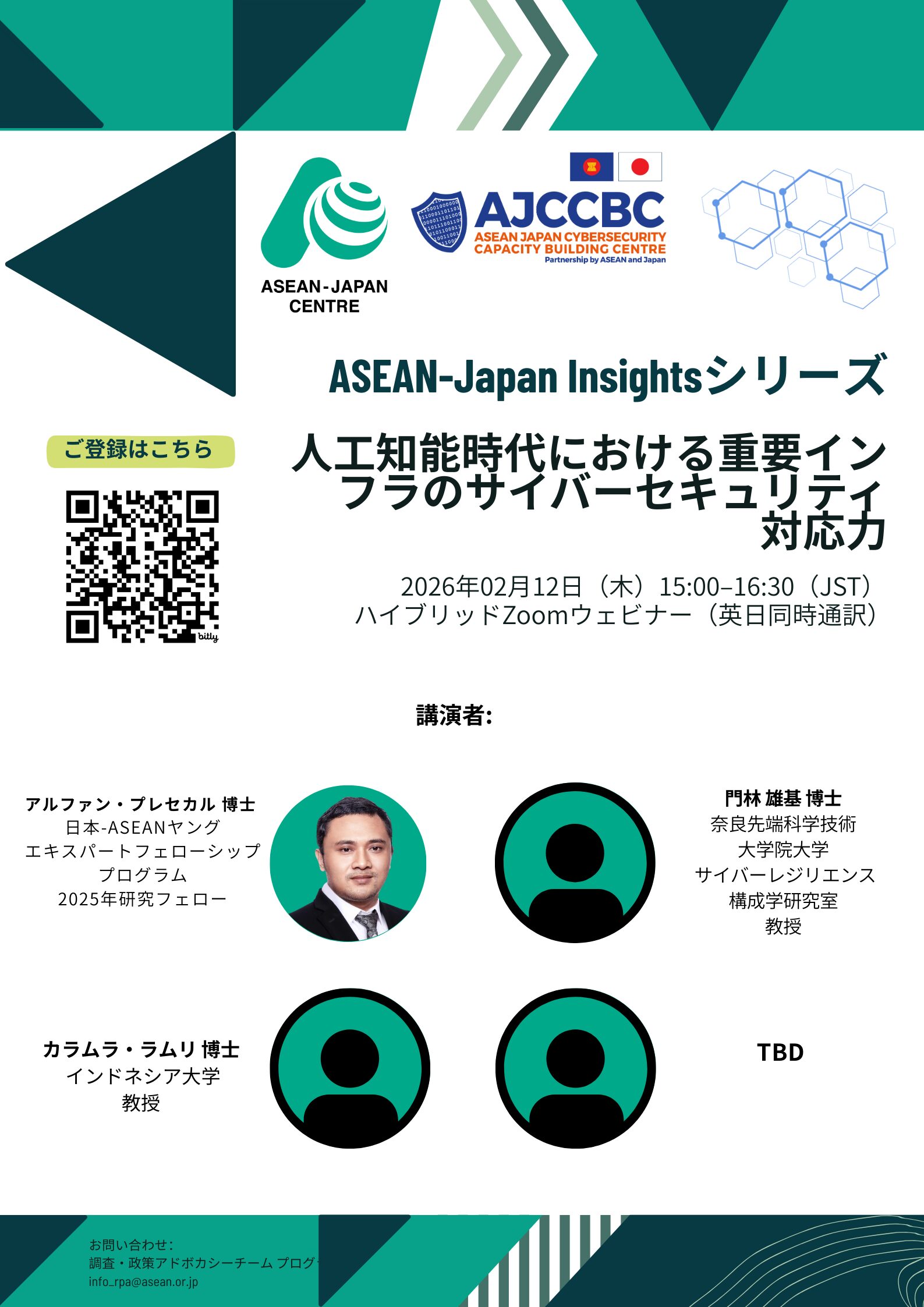 本ウェビナーでは、進展する日ASEAN協力を踏まえ、政策の整合性、AIを活用した脅威インテリジェンス、サイバーセキュリティ・ガバナンス、ならびに地域的な能力構築について議論します。エネルギーシステムやサプライチェーンを標的としたサイバー攻撃など、重要インフラを巡る新たなリスクを取り上げるとともに、AI駆動型ツールが検知、対応、レジリエンス強化にどのように貢献し得るかを検討します。また、日ASEAN若手専門家研究フェローが、AI時代におけるサイバーセキュリティ対応力に関する研究成果を、インドネシアを含むASEAN加盟国の事例を基に発表します。学術界、政府、産業界の専門的知見と実務的視点を結集することで、本ウェビナーは、サイバーセキュリティ対応力の強化とAI時代における地域協力の推進に向けた実践的な道筋を明らかにすることを目的としています。