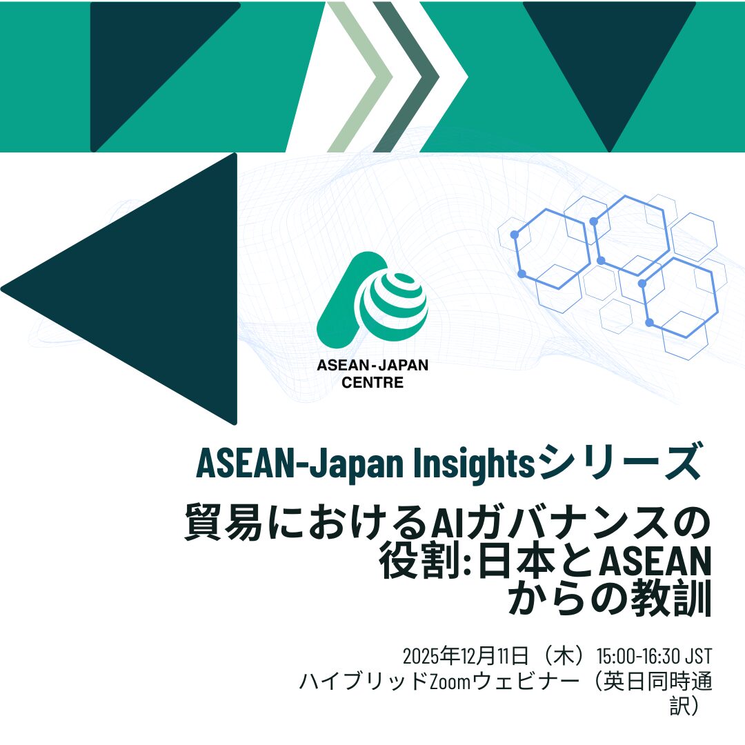 2025年12月11日、日本アセアンセンターは「貿易におけるAIガバナンスの役割:ASEANと日本からの教訓」と題したウェビナーを、ASEAN-Japan Insights Series の一環として開催しました。本ウェビナーでは、ASEANおよび日本の政策担当者、企業関係者、研究者が参加し、AIガバナンスがデジタル貿易、イノベーション、域内協力をどのように支えるかについて議論を行いました。