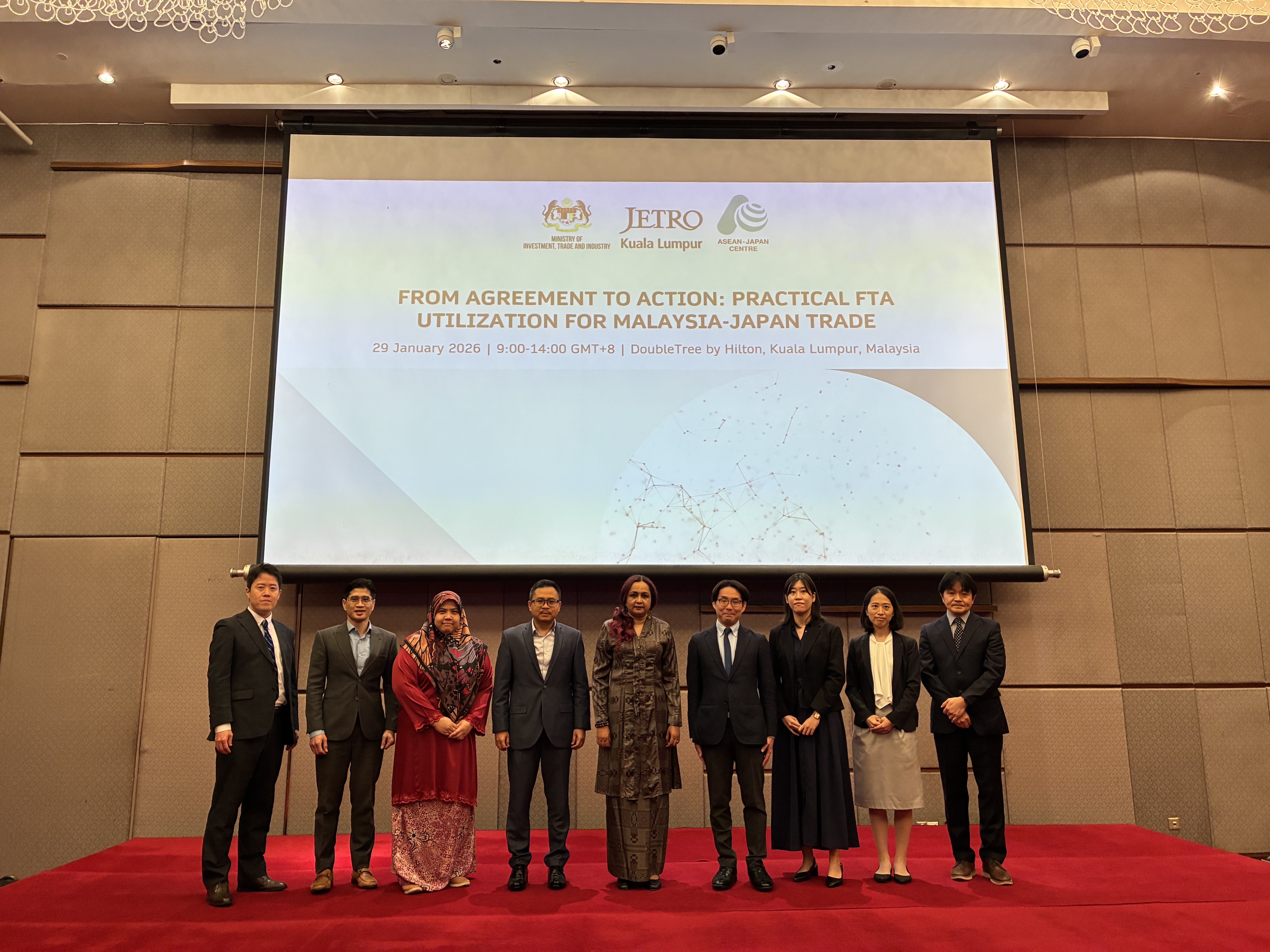 2026年1月29日、日本アセアンセンター(AJC)は、マレーシア投資・貿易・産業省(MITI)およびJETROクアラルンプール事務所との共催により、「協定から実践へ:マレーシア・日本間貿易における実践的FTAの活用」と題したFTA利用促進セミナーを、クアラルンプールのダブルツリーbyヒルトンにて開催しました。本セミナーは、日本の経済産業省(METI)の参加を得て開催され、マレーシア・日本間貿易におけるFTAの実践的活用を推進する両国の強いコミットメントを示すものとなりました。