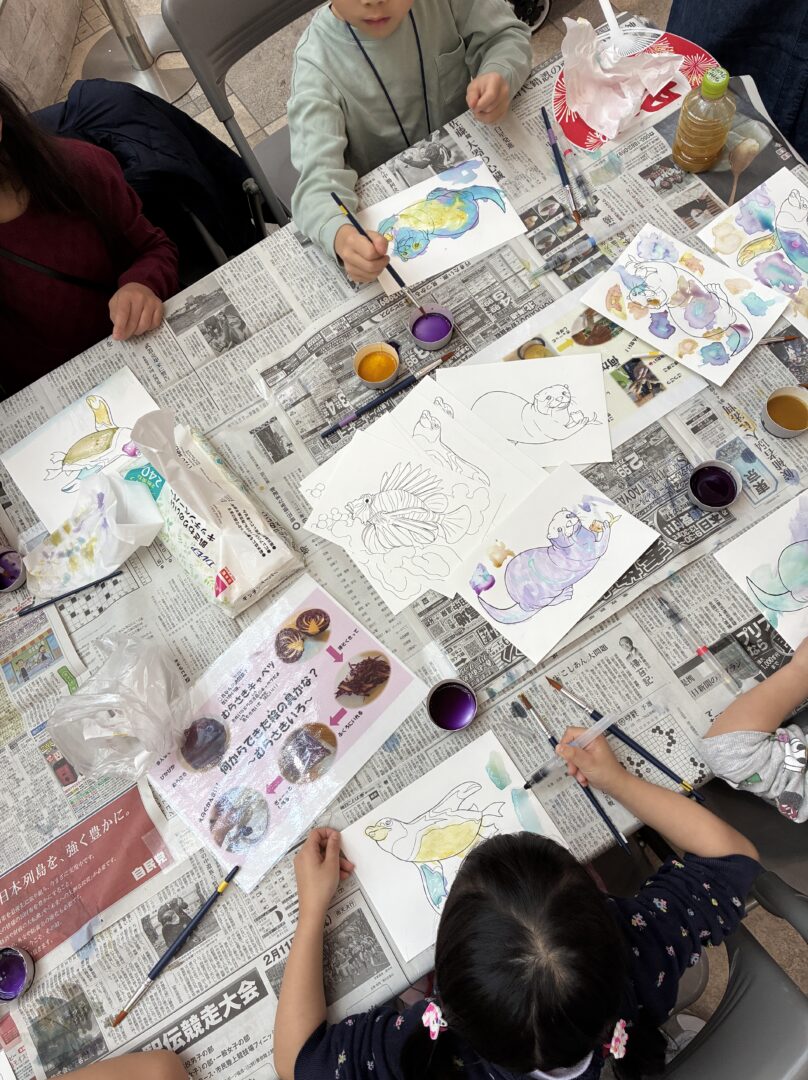 主催チームが手作りした、プラスチックフリーの、野菜由来の生き物と海に優しい手作り絵の具を使ったぬりえを体験するワークショップには、140名以上の子供が参加し、ASEAN諸国でなじみ深いカワウソとカサゴ、またサンシャイン水族館で人気のペンギンのオリジナルぬりえ(セリーン氏制作)を楽しみました。さらに、お酢や重曹を加えると色が変わることを学び、各自独創的なカラフルなアートを仕上げました。