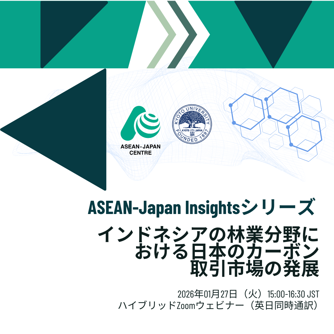 2026年1月27日、日本アセアンセンターは京都大学ASEAN拠点との共催により、「インドネシア林業分野における日本のカーボントレード市場の展開」をテーマとしたウェビナーを、ASEAN-Japan Insights Seriesの一環として開催しました。本ウェビナーには、学界、民間部門、政府関係者の専門家が参加し、高い環境完全性を有するカーボン市場の強化および、日本と ASEAN における持続可能な自然由来ソリューションの推進に向けた実践的な道筋について議論が行われました。