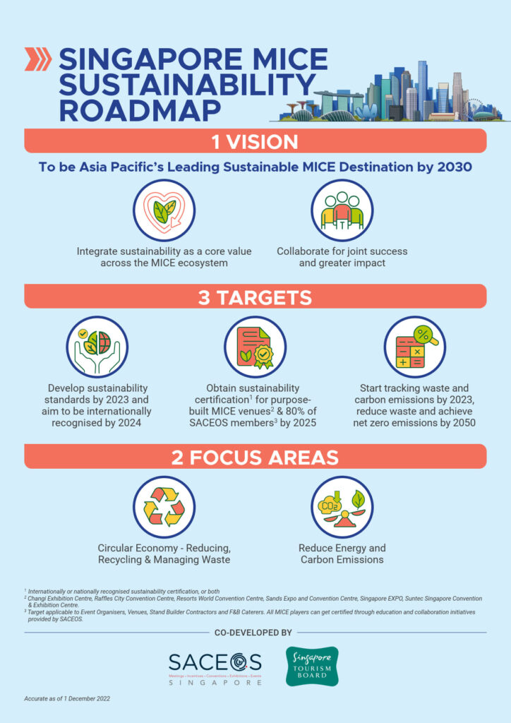 By 2025, all purpose-built MICE venues and 80% of SACEOS members were expected to achieve sustainability certification. As of 31 December 2025, this target had been met, with all six purpose-built MICE venues internationally or nationally certified, and more than 80% of SACEOS members having achieved certification. National baselines for waste and carbon emissions have also been established. The MICE Sustainability Roadmap further aims to achieve net-zero emissions by 2050.