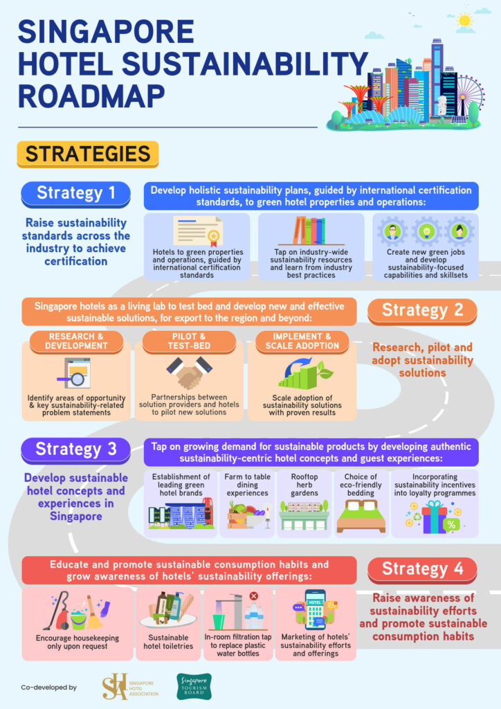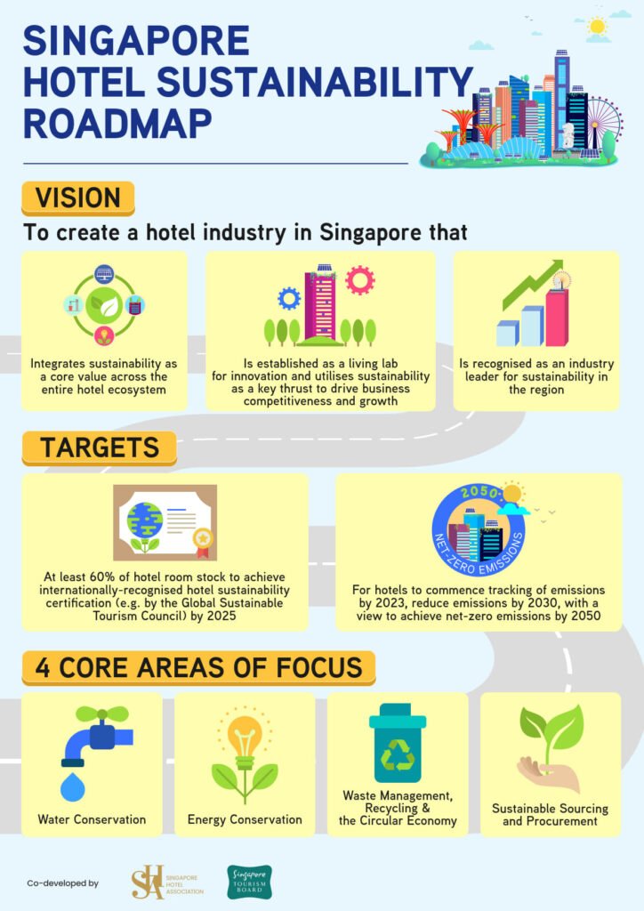 The Hotel, MICE, and Attractions Sustainability Roadmaps were developed by the Singapore Tourism Board (STB) in close collaboration with key industry associations. These include the Singapore Hotel Association (SHA), the Singapore Association of Convention & Exhibition Organisers & Suppliers (SACEOS), and the Association of Singapore Attractions (ASA).